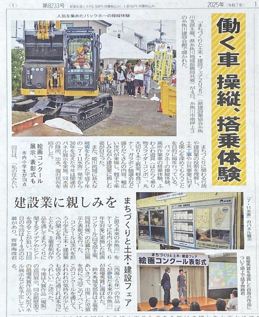 10月4日(土)、新潟県建設業協会糸魚川支部が主催し県糸魚川地域振興局共催の「まちづくりと土木・建設フェア2025」を開催いたしました。