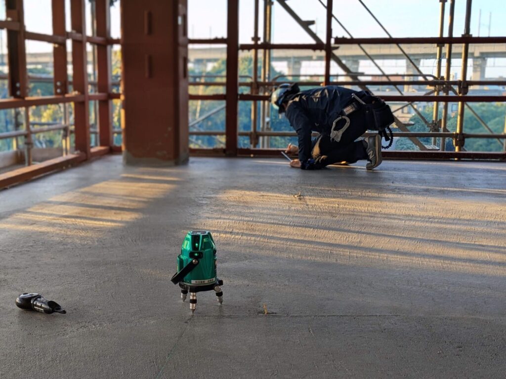 現場では、鉄骨建方後に行う「墨出し(すみだし)」が重要な工程のひとつです。
