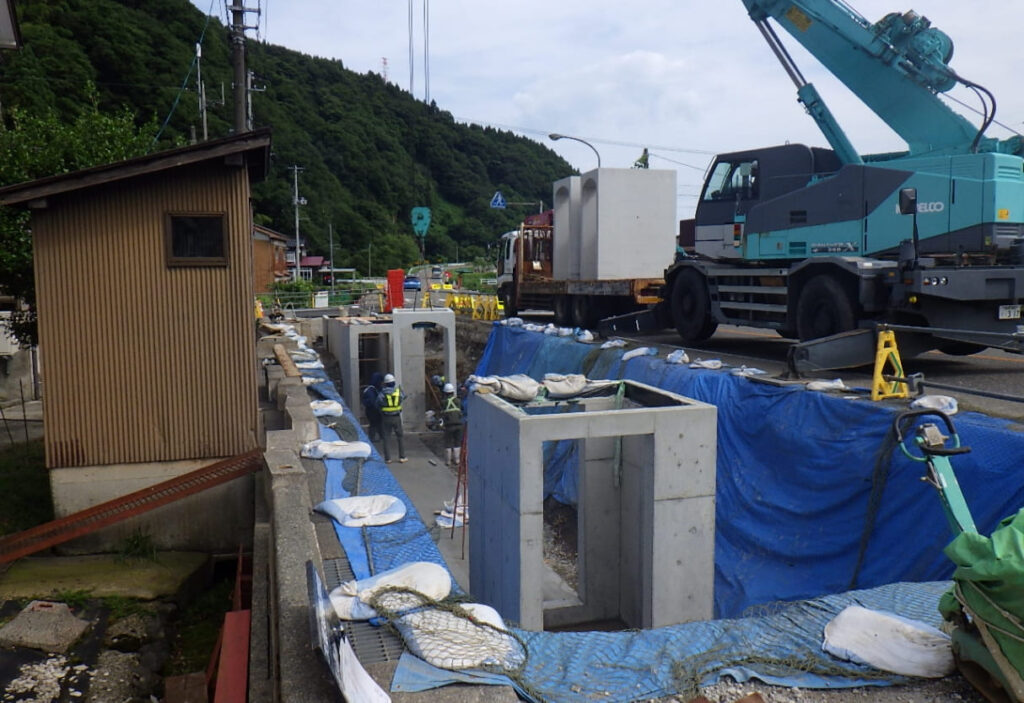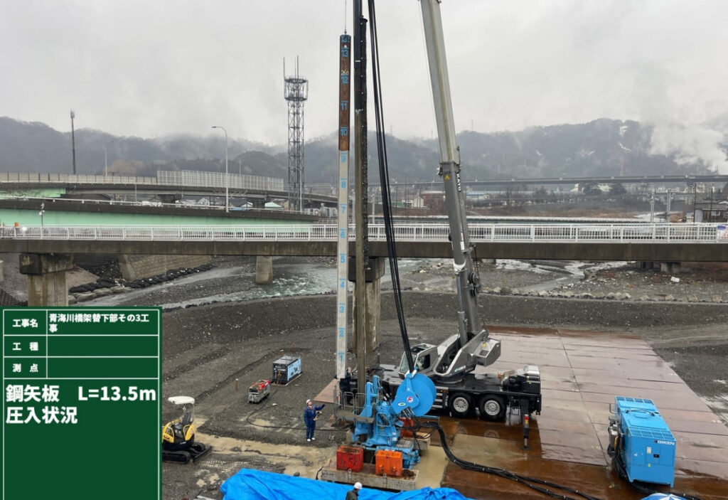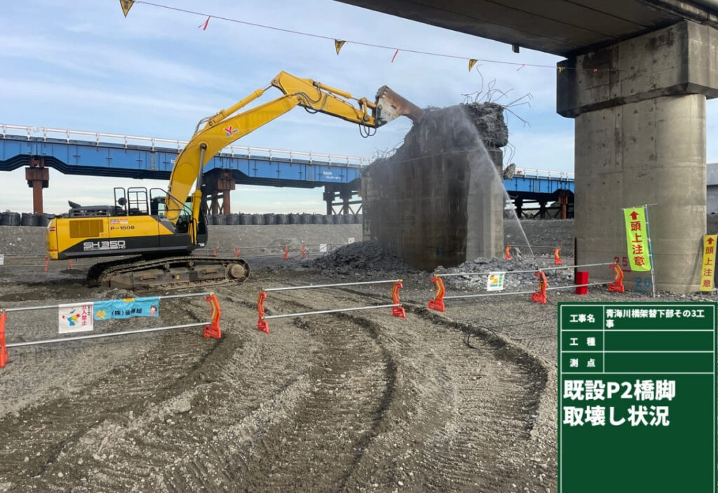 国道8号線青海川橋の塩害で損傷を受けた旧橋脚を2基撤去する工事でした。 国道で交通量も多く冬期間での施工で高波等の厳しい現場状況でしたが、工法を工夫し施工性を上げ円滑に進めることができました。
