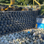 本工事はブロックを用いて積上げた床固め工を施工し土砂の流出を防ぎ安定的に土砂を堆積させる工事であり、狭隘な施工場所での作業であったため仮川廻し等の仮設に苦労しましたが地すべり防止対策に貢献しました。