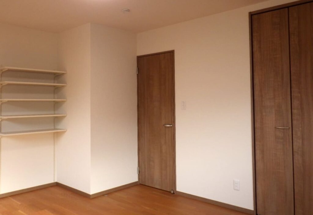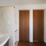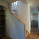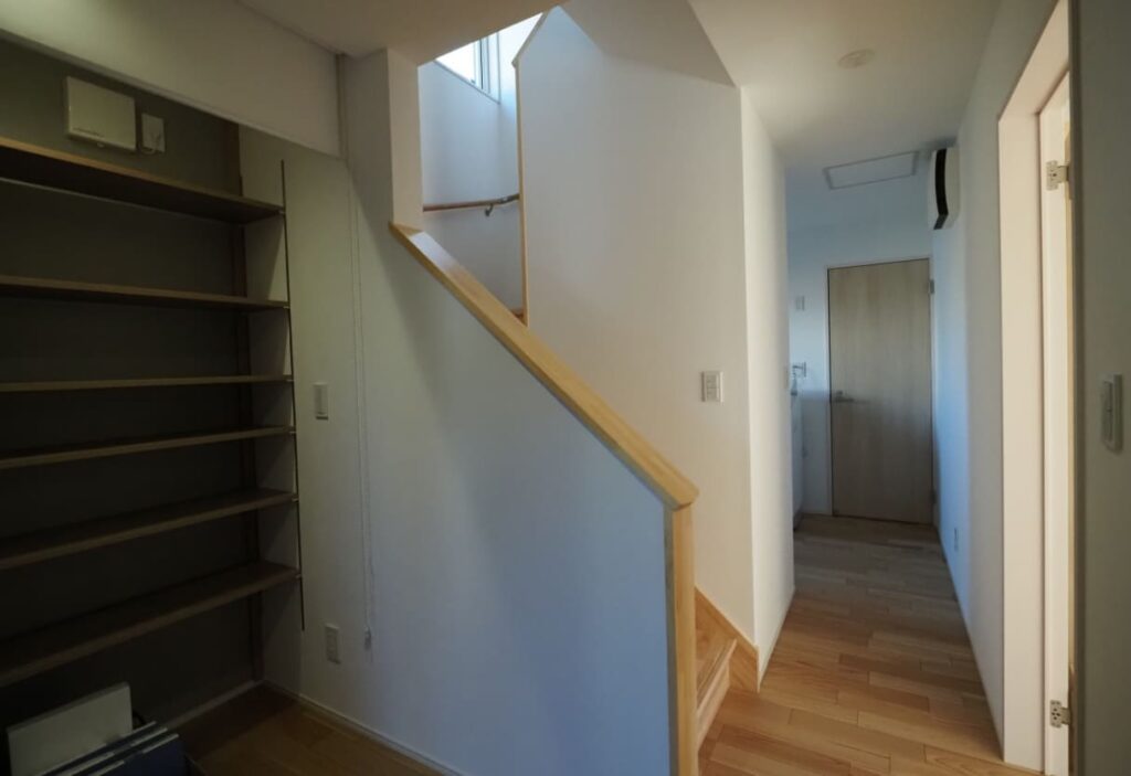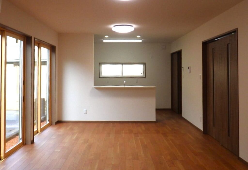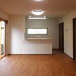 二世代が暮らす新築住宅。豊かな緑に囲まれた住まい。開放感あふれるリビングで窓からは四季折々の景色を楽しめます。壁一面の収納棚により充実の収納スペースです。